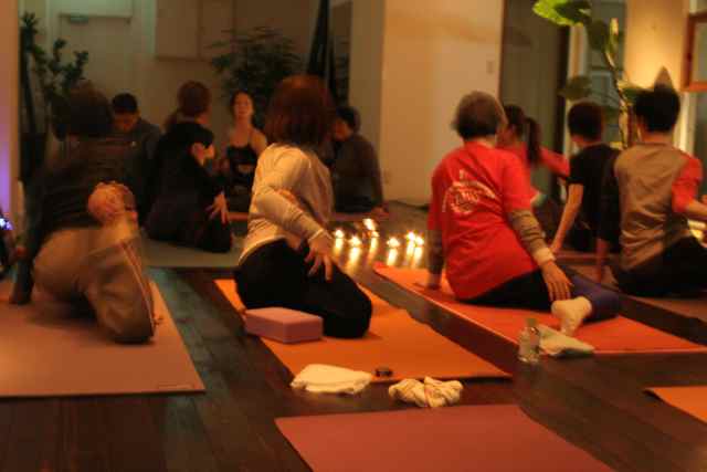 本当に真っ暗な空間の中、キャンドルの明かりだけでのヨガ。