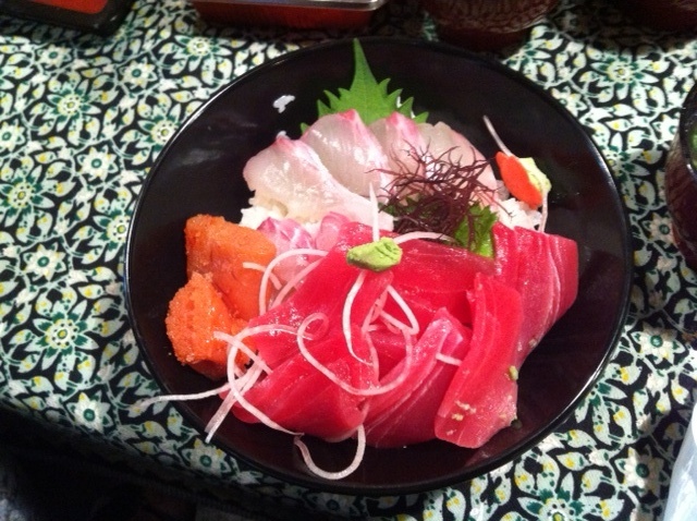 丼ぶりにご飯だけ買い、丼ぶり片手に好きな具を買いに市場へ