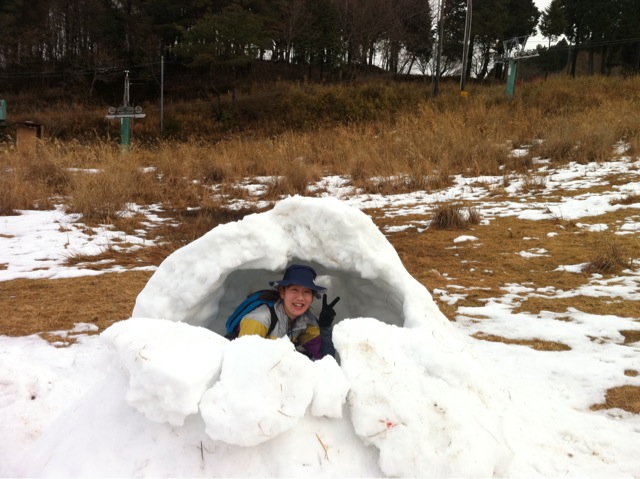 雪が残るゲレンデ跡で雪遊び