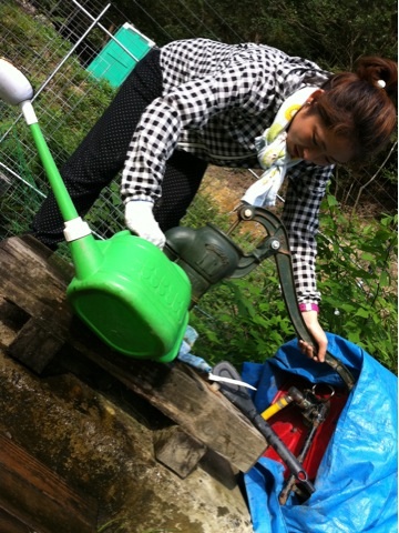 レトロなポンプで山の水をくみます‼