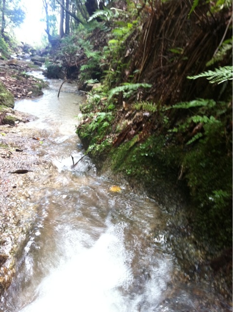 冷たい風が吹く沢沿いのトレイル