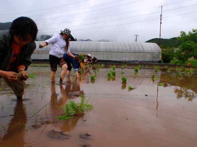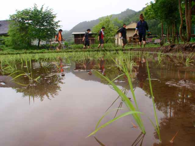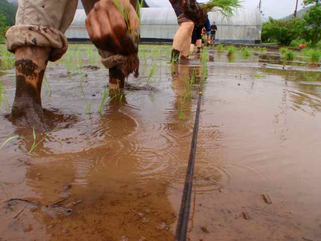 水をはった田んぼの中に裸足で入って苗を植えてゆきます!!